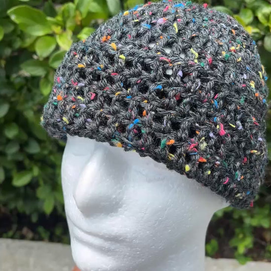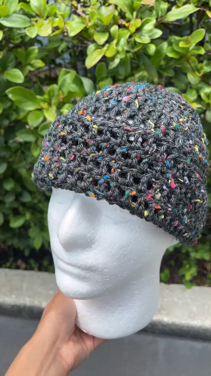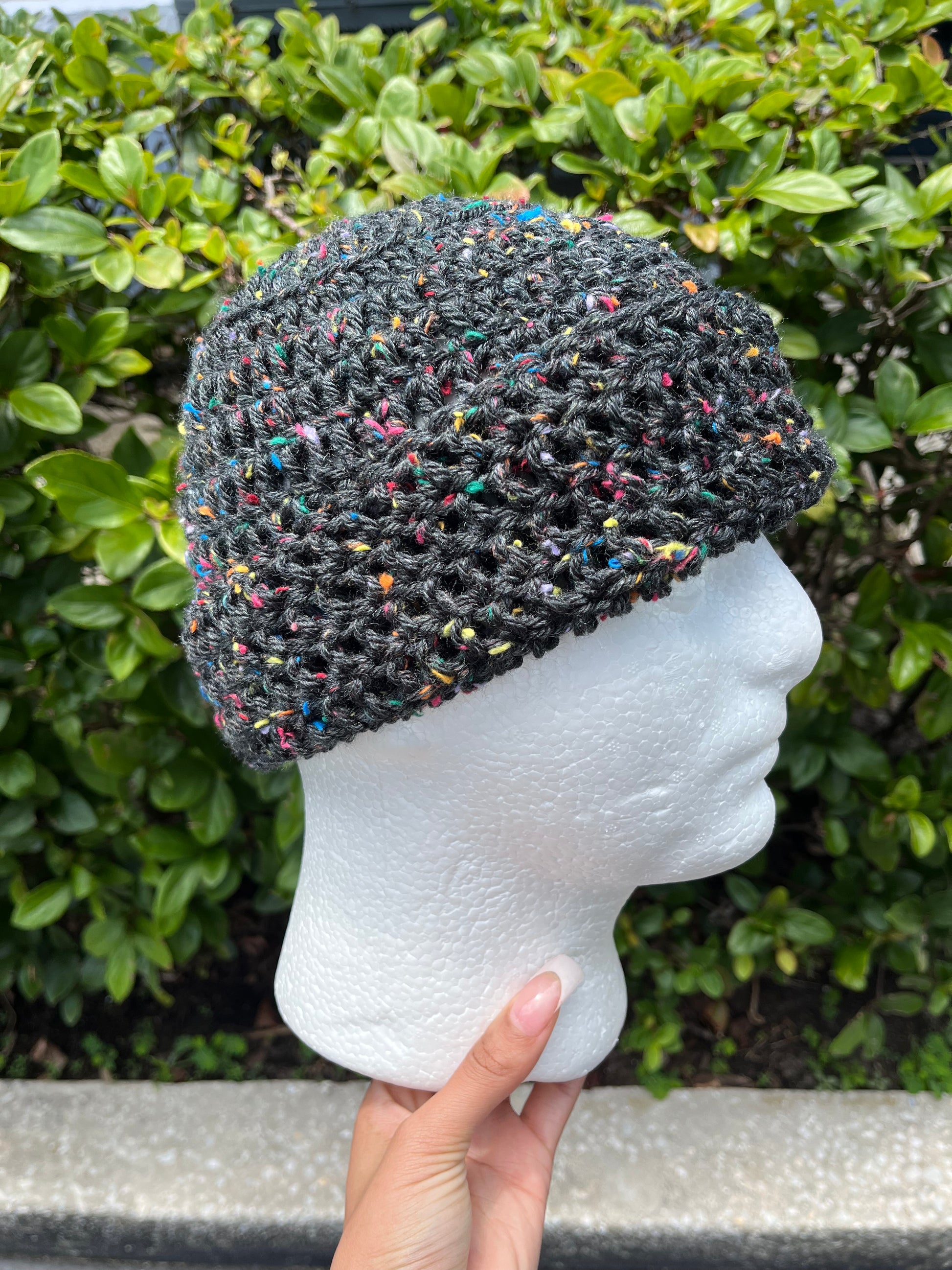 This unique crochet beanie offers versatile wear for any season. Its substantial thickness provides warmth and comfort during colder months, while its lightweight design ensures breathability year-round. The bottom can be folded up to create a brim or left loose for a relaxed, slouchy look.