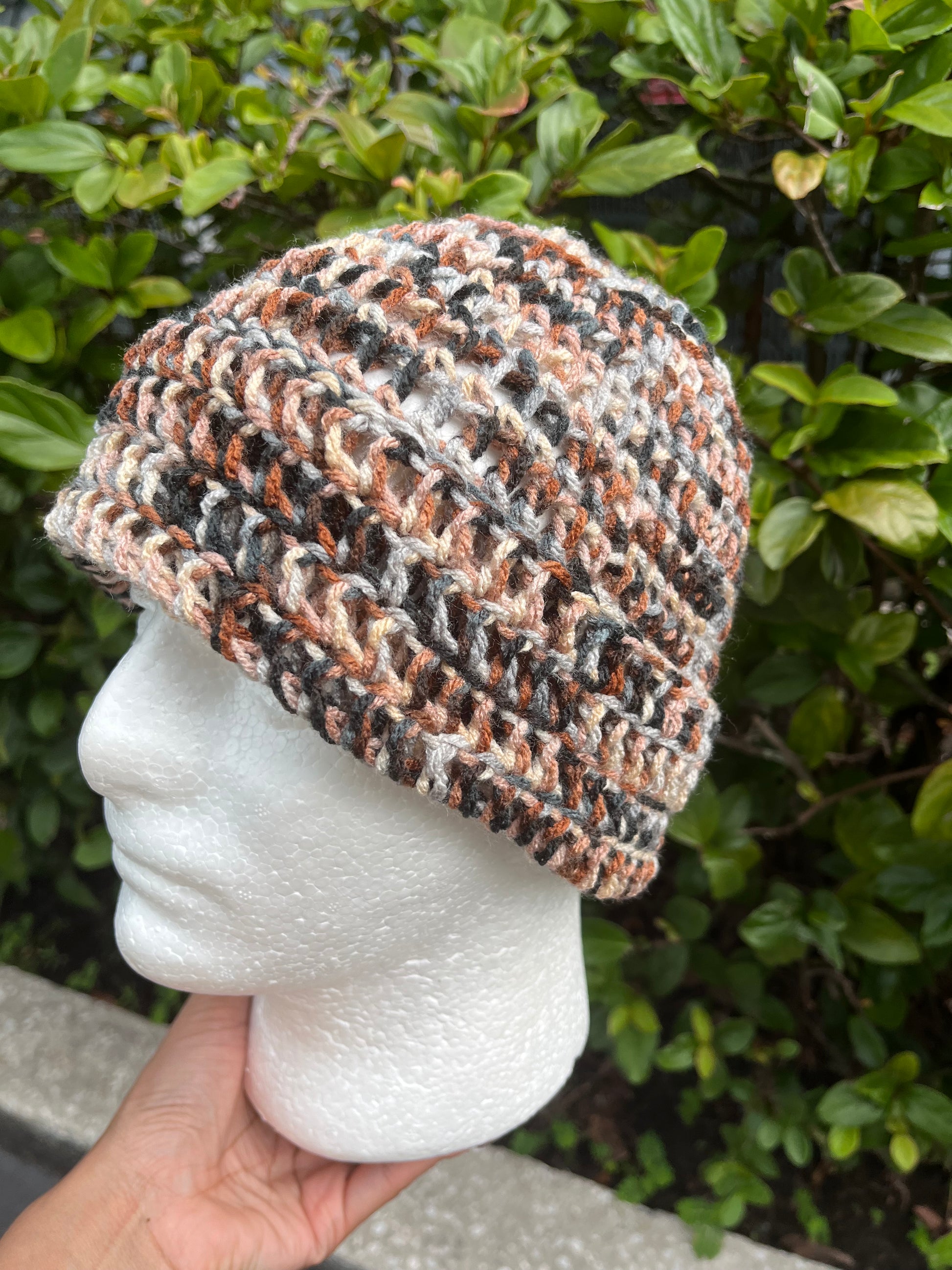 This unique crochet beanie offers versatile wear for any season. Its substantial thickness provides warmth and comfort during colder months, while its lightweight design ensures breathability year-round. The bottom can be folded up to create a brim or left loose for a relaxed, slouchy look.
