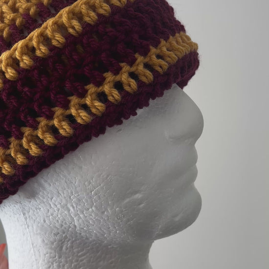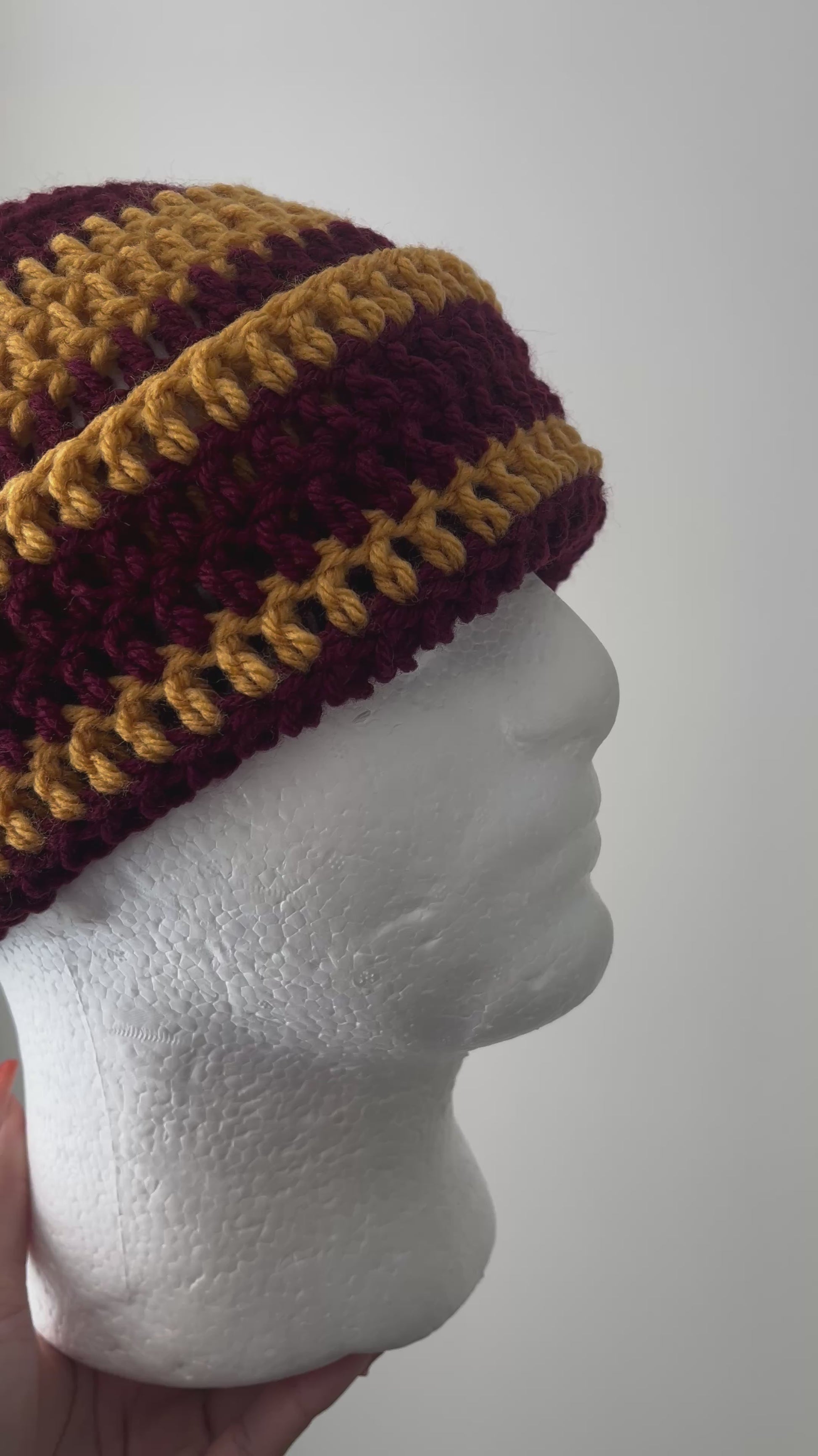 This unique crochet beanie offers versatile wear for any season. Its substantial thickness provides warmth and comfort during colder months, while its lightweight design ensures breathability year-round. The bottom can be folded up to create a brim or left loose for a relaxed, slouchy look.