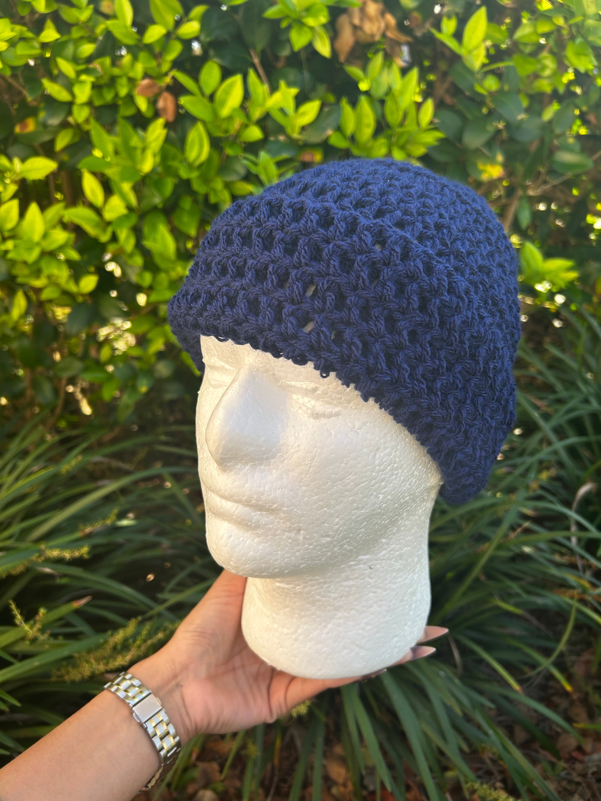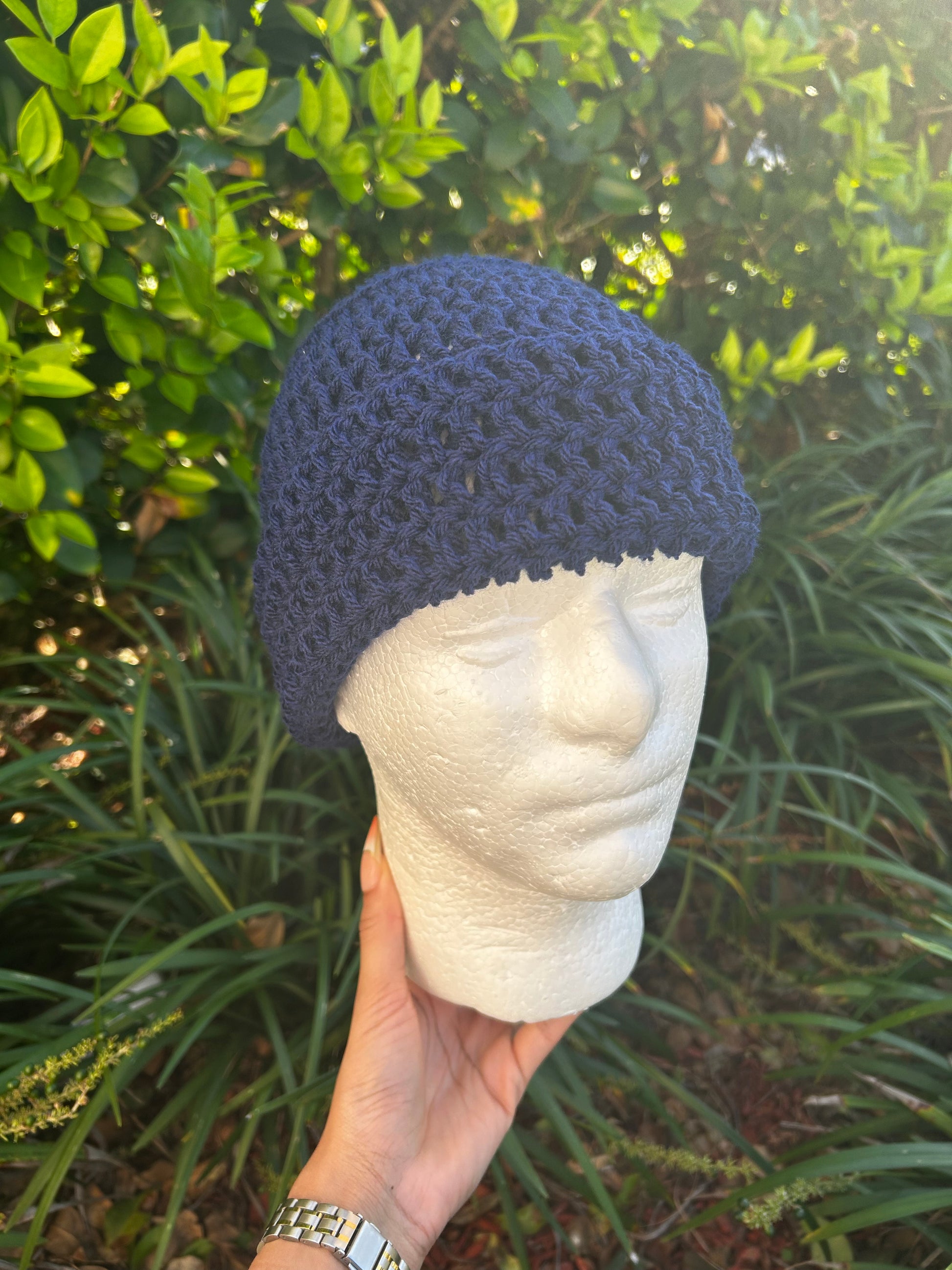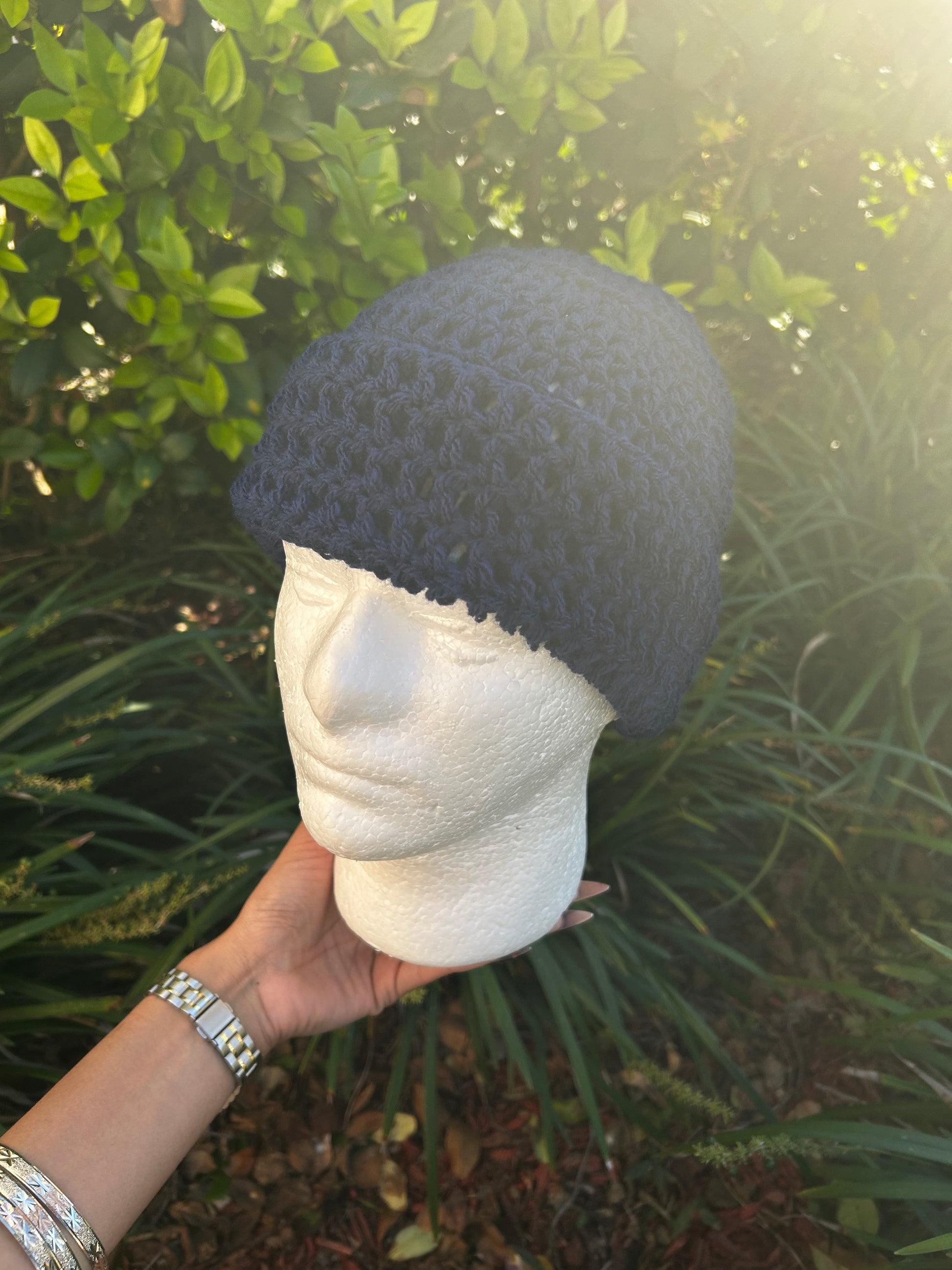 This unique crochet beanie offers versatile wear for any season. Its substantial thickness provides warmth and comfort during colder months, while its lightweight design ensures breathability year-round. The bottom can be folded up to create a brim or left loose for a relaxed, slouchy look.
