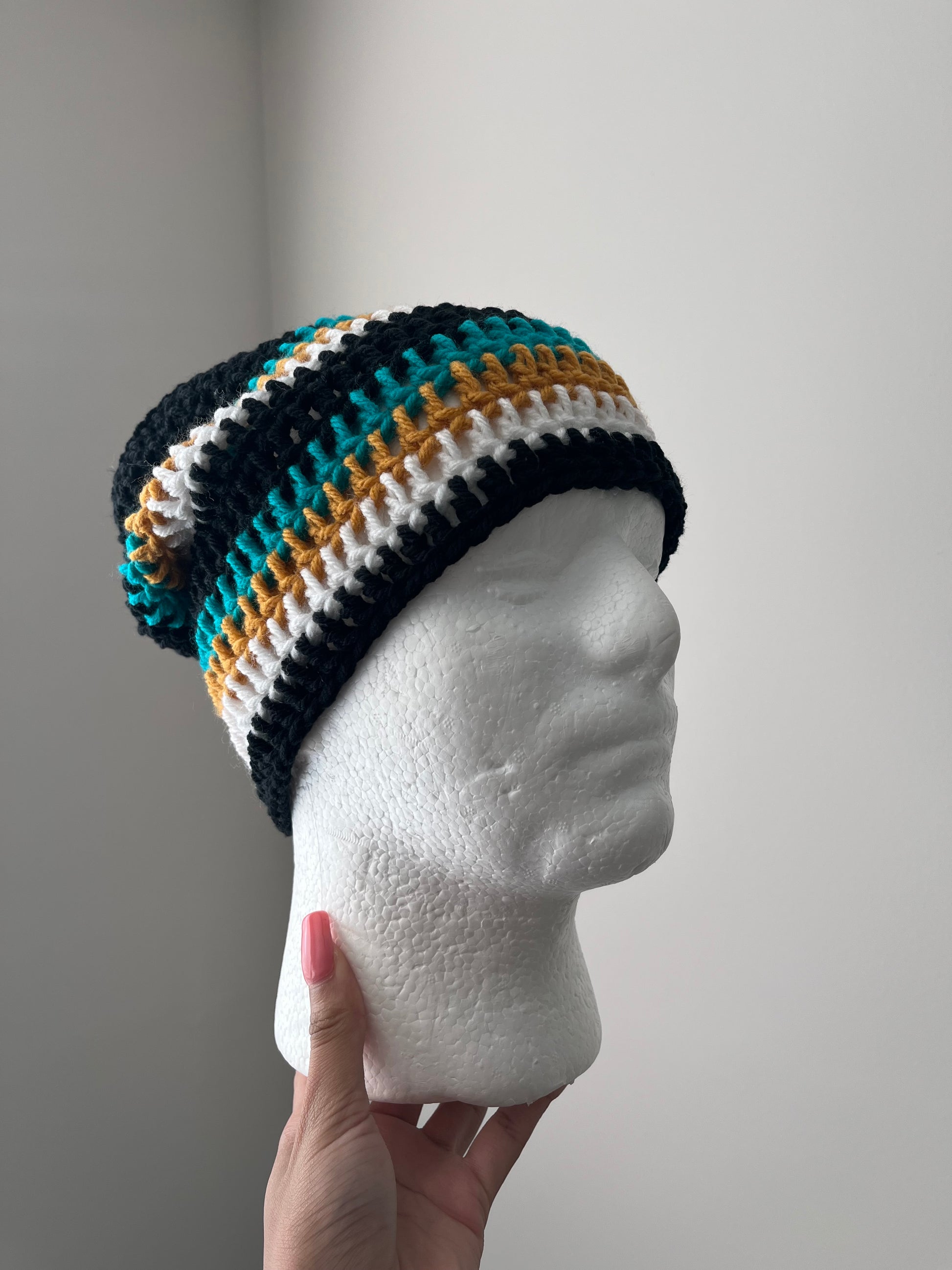 This unique crochet beanie offers versatile wear for any season. Its substantial thickness provides warmth and comfort during colder months, while its lightweight design ensures breathability year-round. The bottom can be folded up to create a brim or left loose for a relaxed, slouchy look.