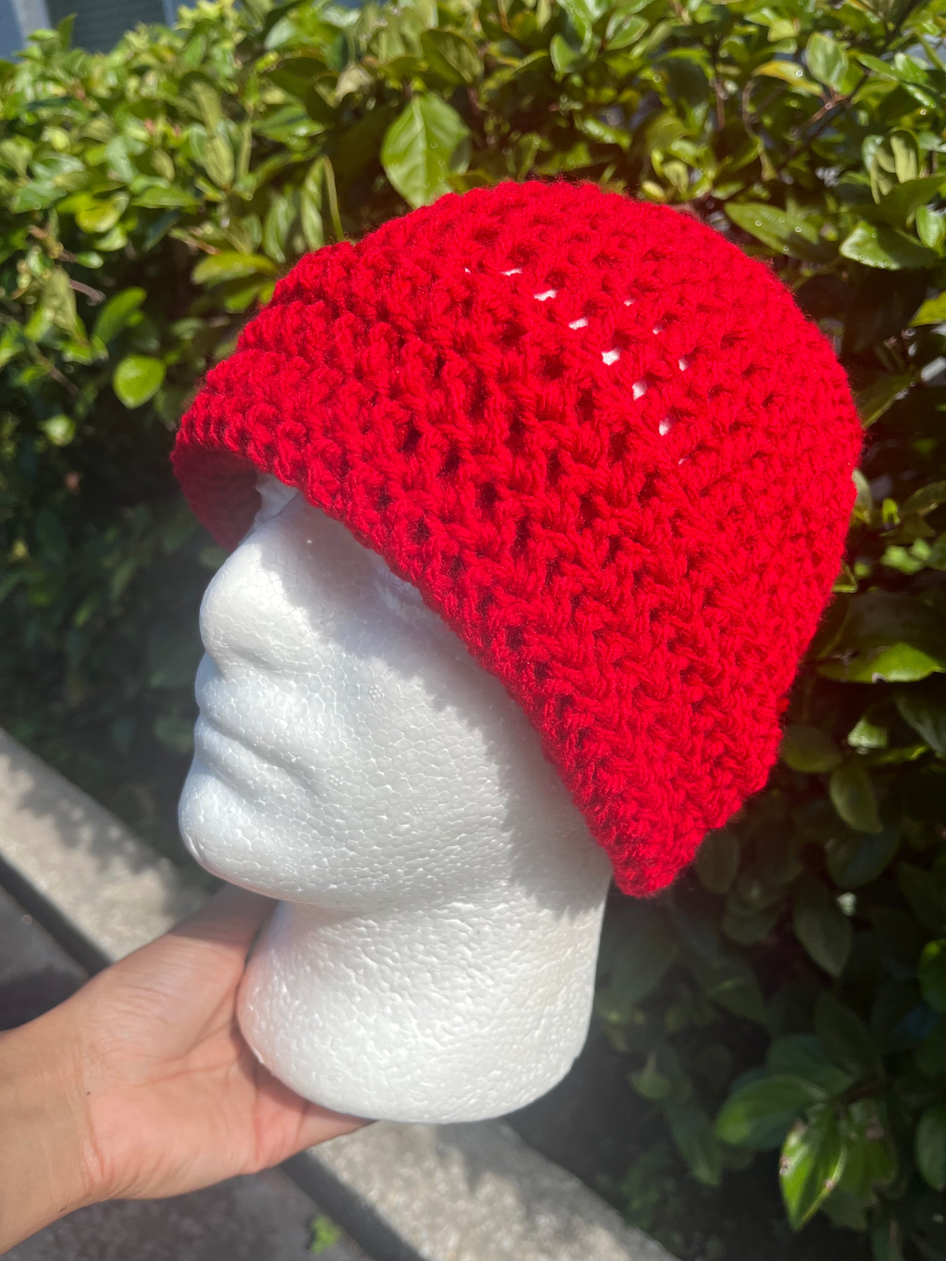 This unique crochet beanie offers versatile wear for any season. Its substantial thickness provides warmth and comfort during colder months, while its lightweight design ensures breathability year-round. The bottom can be folded up to create a brim or left loose for a relaxed, slouchy look.