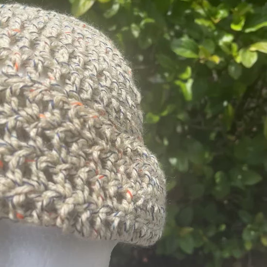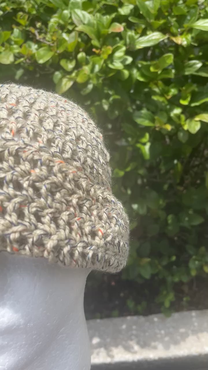 This unique crochet beanie offers versatile wear for any season. Its substantial thickness provides warmth and comfort during colder months, while its lightweight design ensures breathability year-round. The bottom can be folded up to create a brim or left loose for a relaxed, slouchy look.