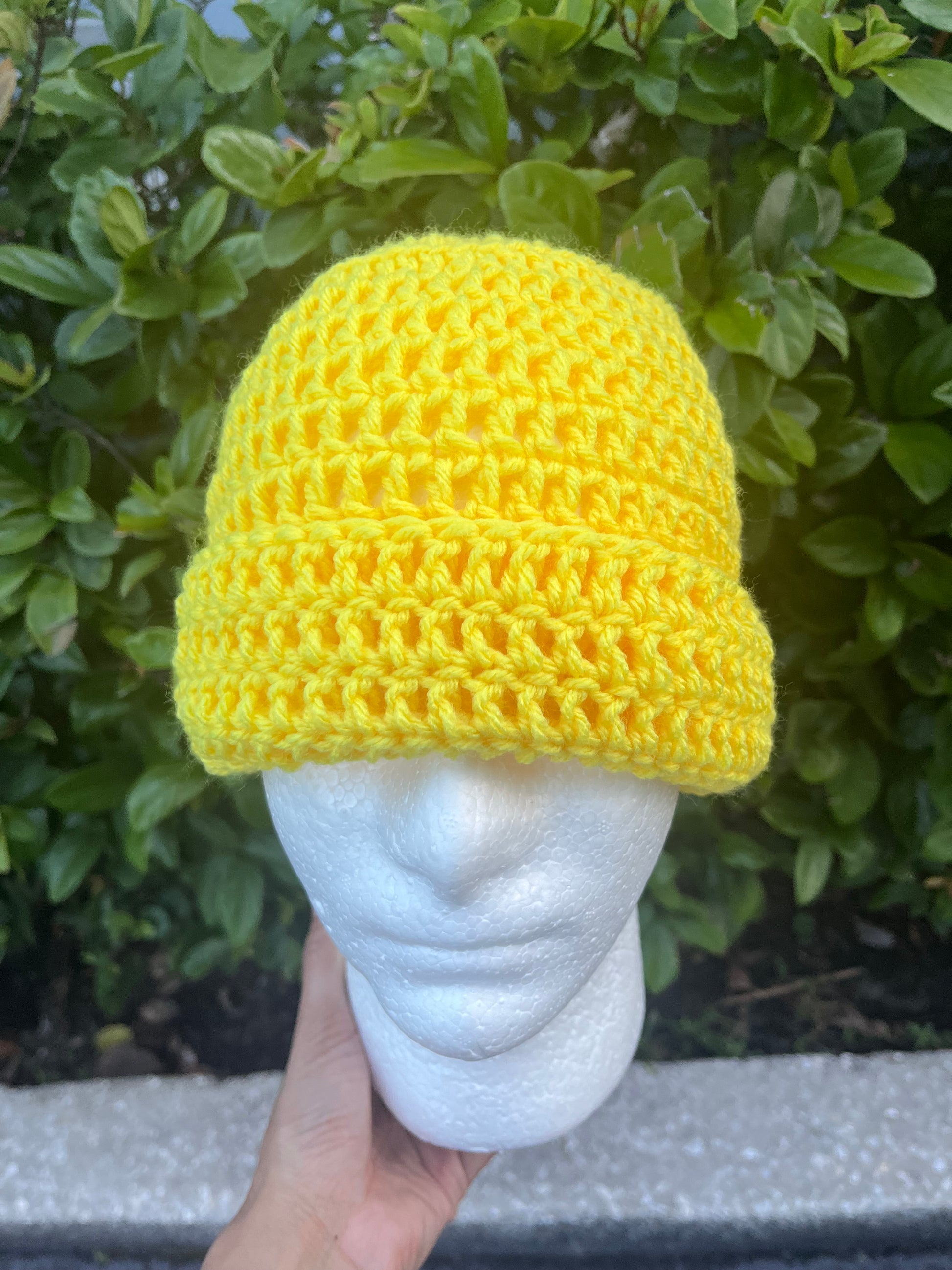This unique crochet beanie offers versatile wear for any season. Its substantial thickness provides warmth and comfort during colder months, while its lightweight design ensures breathability year-round. The bottom can be folded up to create a brim or left loose for a relaxed, slouchy look.
