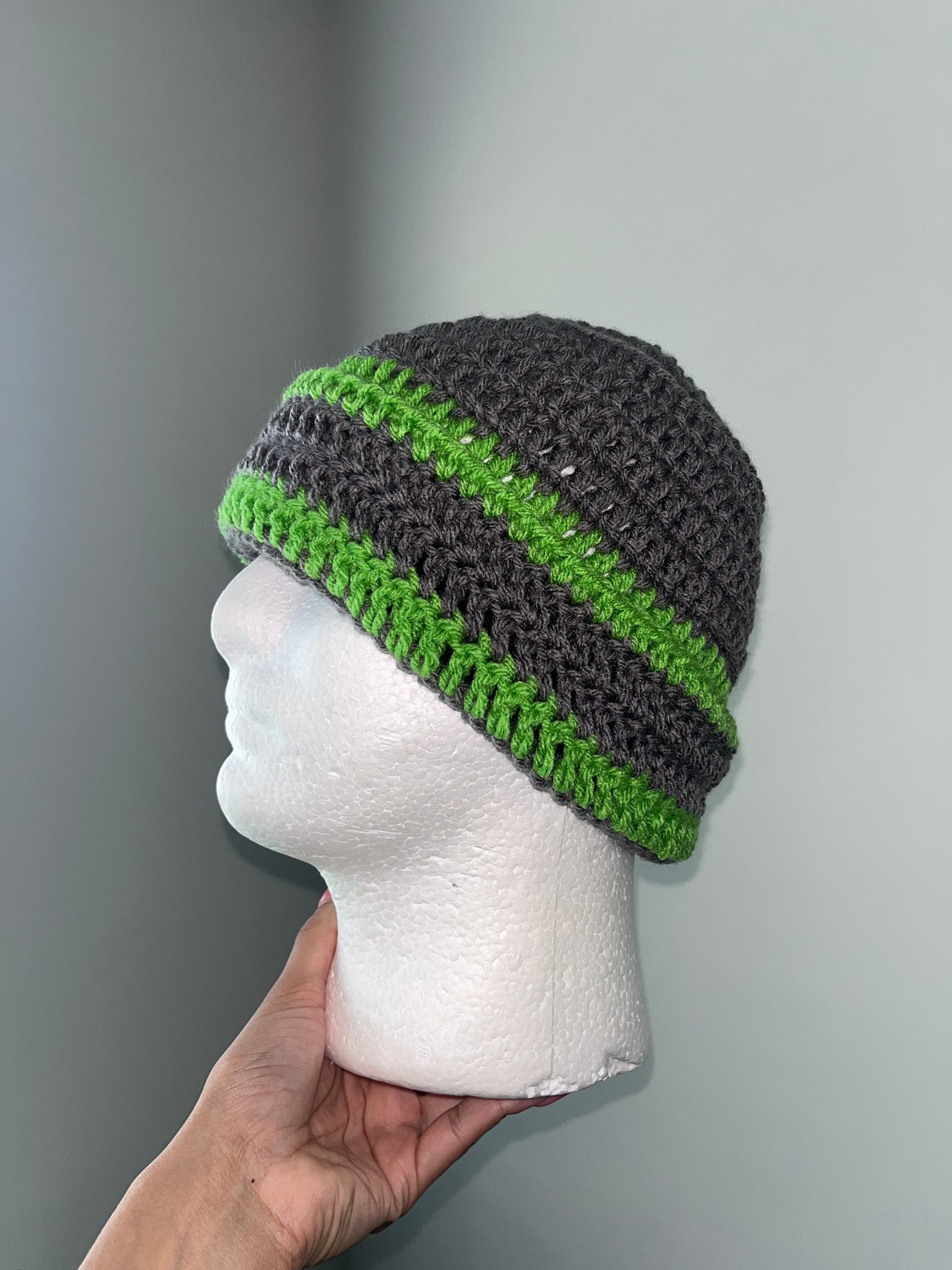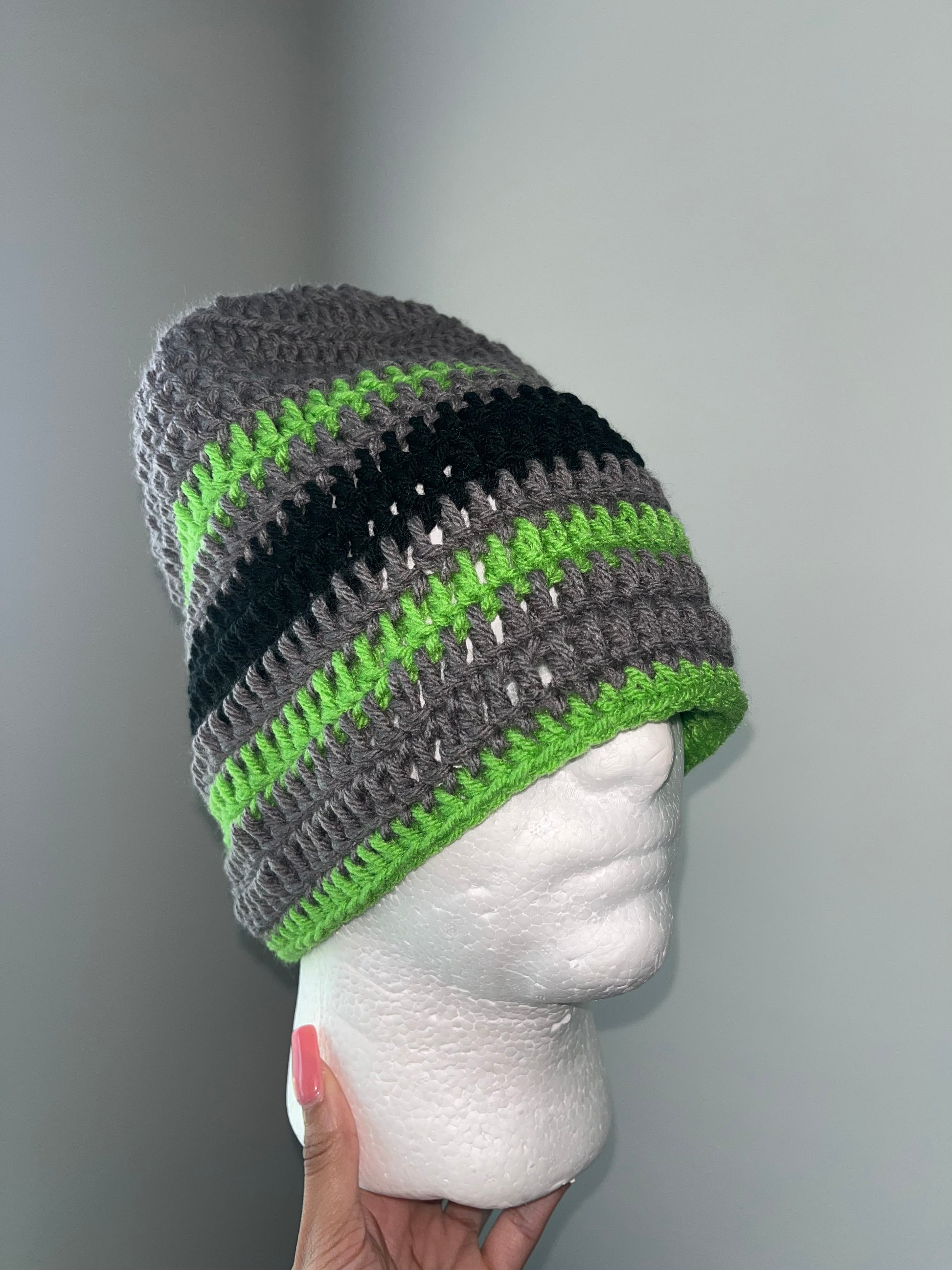 This unique crochet beanie offers versatile wear for any season. Its substantial thickness provides warmth and comfort during colder months, while its lightweight design ensures breathability year-round. The bottom can be folded up to create a brim or left loose for a relaxed, slouchy look.